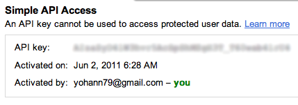 Note : Si vous me suivez régulièrement, et notamment les articles concernant l’API Google+ vous pourrez retrouver la méthode pour obtenir la clé API.