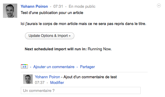 Le plugin ira alors vérifier votre profil Google+ toutes les heures et publiera de nouveaux articles sur votre blog WordPress en fonction de votre paramétrage.
