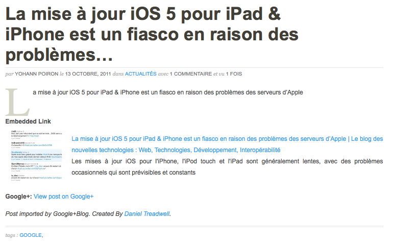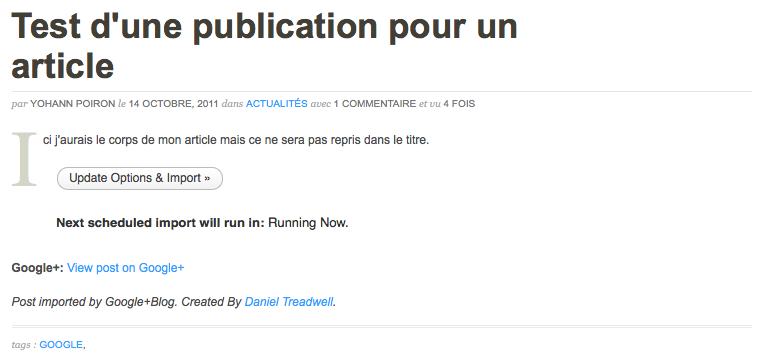 Il existe deux versions du plugin : une version gratuite et une payante. Vous pouvez télécharger ici les deux versions. La version gratuite propose un backlink, un hyperlien pointant vers la page Web du plugin, accompagné par le texte : “Post imported by Google+Blog. Created By Daniel Treadwell”. Si vous achetez la version payante pour la modique somme de 10$ (7,3€), les backlinks seront supprimés. Tous les articles importés sont également accompagnés d’un lien vers la publication d’origine Google+.