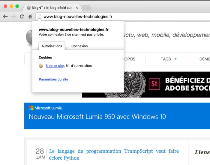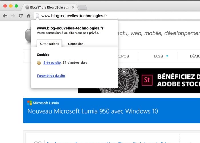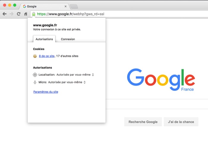 Chrome distingue les pages HTTP et HTTPS en utilisant une icône à la gauche de l’URL, où le favicon du site varie en fonction des paramètres de sécurité de la page en cours. Un site non chiffré est marqué par une icône d’une page blanche, tandis qu’un site sécurisé est marqué avec un cadenas vert. Si une page prétend être sécurisée, mais que Chrome voit des problèmes avec sa mise en œuvre, le cadenas est secondé par un X rouge. En cliquant sur l’icône, davantage d’informations sur le site vont être affichées.