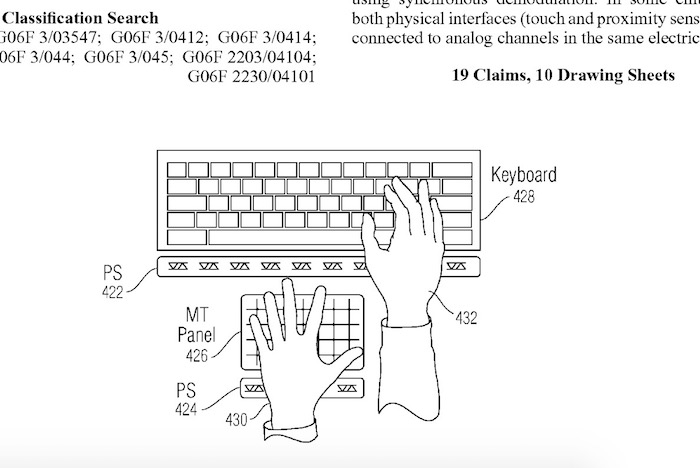 Apple fait également paraitre que l’écran du périphérique pourrait être intercalé entre une rangée de capteurs et le panneau tactile, afin de détecter la saisie. Sinon, il est également possible de voir la détection de proximité n’occupant qu’une partie de l’écran.