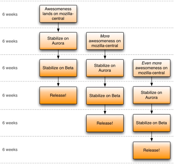 Dans son article de blog annonçant ce nouvel agenda de développement, Mozilla a noté que la société « va désormais être en mesure d’ajuster les dates de libération, afin de répondre aux besoins des utilisateurs et des marchés émergents, et d’avoir au moins six semaines de travail avant chaque nouvelle version du navigateur ».