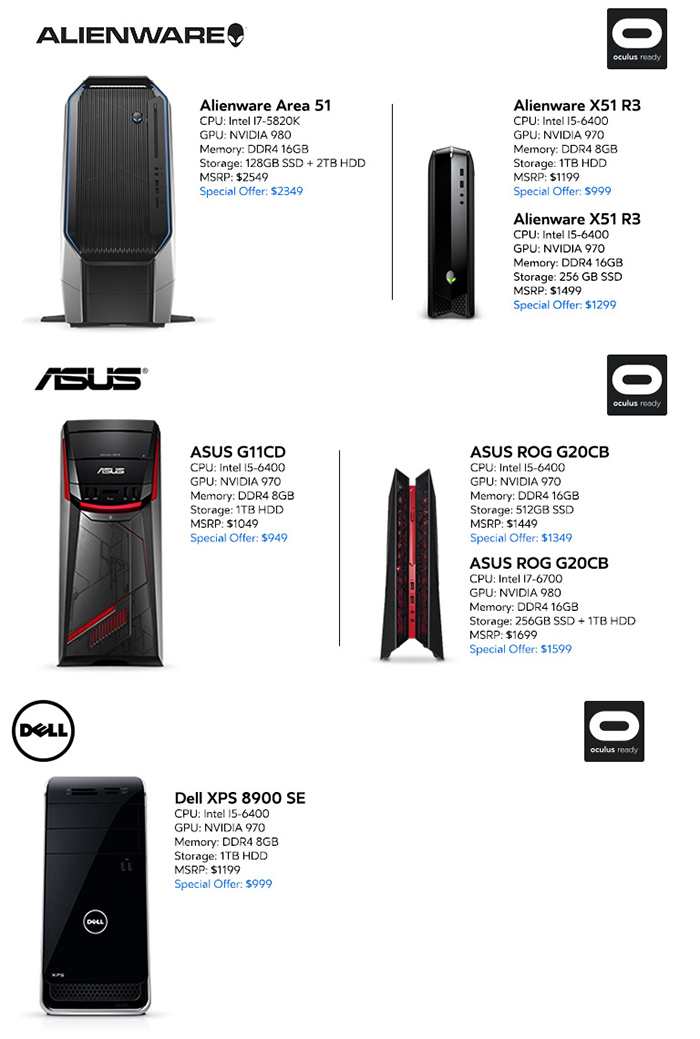 Concernant les PC vendus dans le cadre du programme « Oculus Ready », le modèle d’entrée de gamme est celui de ASUS. Il dispose d’un processeur Intel Core i5 de 6e génération, d’une carte graphique NVIDIA GeForce GTX 970, de 8 Go de mémoire vive (RAM) et d’un disque dur de 1 To (HDD). Pour le modèle le plus haut de gamme, vous allez obtenir un châssis Alienware produit par Dell, embarquant une puce Intel Core i7, un GPU GTX 980 et 16 Go de mémoire vive, ainsi qu’un SSD de 128 Go, couplé à un disque dur mécanique de 2 To.