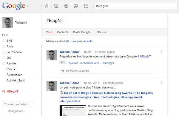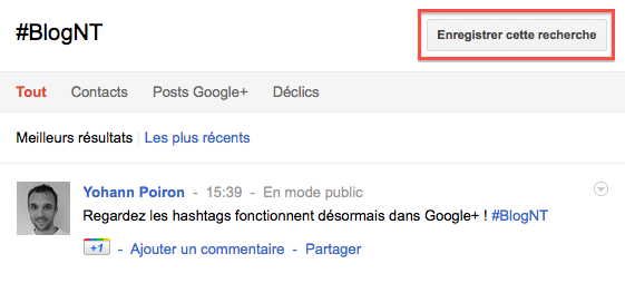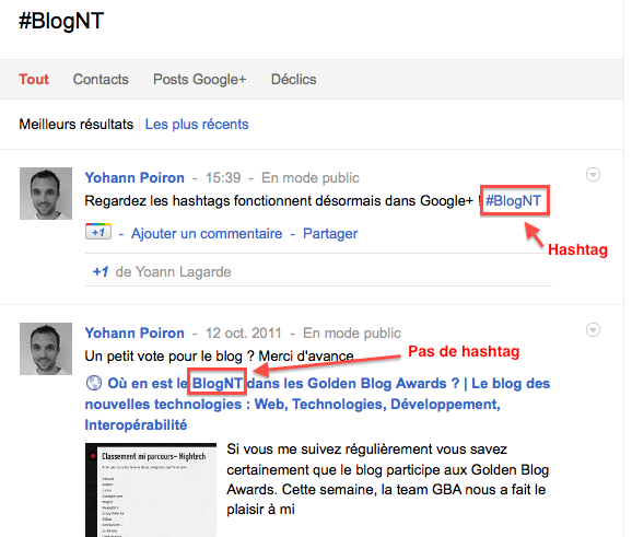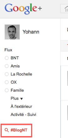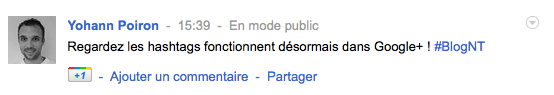 Les hashtags dans Google+ sont similaires à ce que l’on peut trouver sur Twitter. Tapez un “#” devant les mots pour en faire un lien cliquable. Par exemple, si nous voulions utiliser le hashtag “BlogNT” comme l’exemple ci-dessus, il suffirait de taper : #BlogNT.