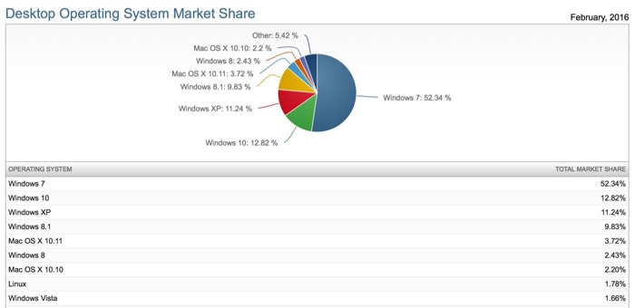 Mais, Windows 10 a encore un long chemin à parcourir avant d’être le système d’exploitation le plus populaire, ou même la version la plus populaire de Windows. Windows 7 est de loin le système d’exploitation de bureau le plus populaire, avec 52,34 % du marché. Cela signifie qu’il y a davantage d’ordinateurs sous Windows 7 qu’il y a d’ordinateurs fonctionnant sous OS X, Linux, et d’autres versions de Windows combinées.