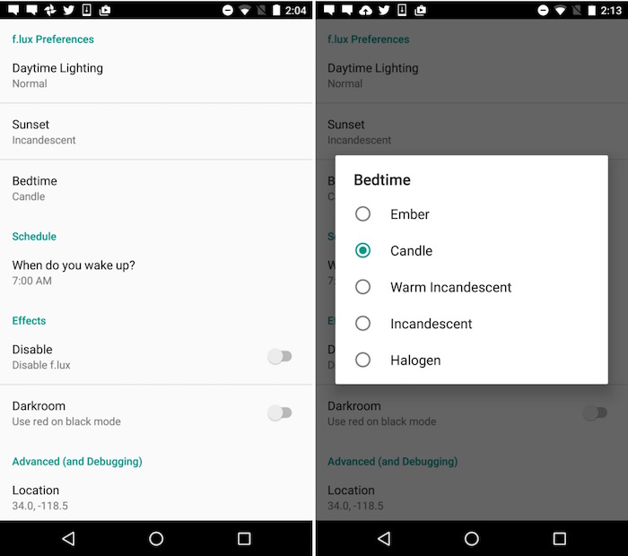 Comme avec d’autres versions de son application, F.lux vous permettra de contrôler le moment de la journée où vous voulez passer à un autre mode, et quelle est la température que vous souhaitez utiliser.