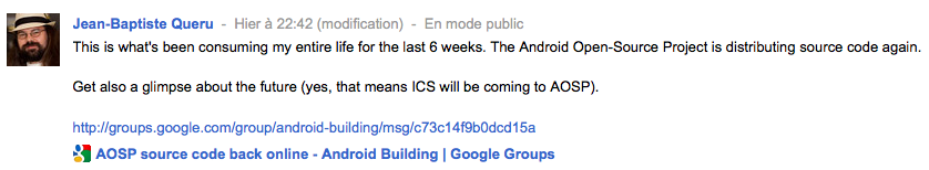 Cependant, avec la confirmation de Queru, via une publication sur son profil Google+, Ice Cream Sandwich ne devrait pas subir le même sort et il devrait être disponible via l’Android Open Source Project dans un avenir proche :