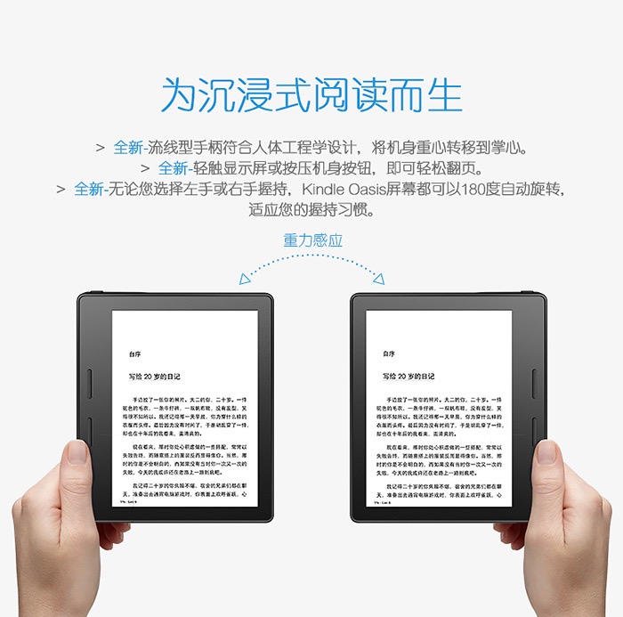 Connu sous le nom Kindle Oasis, la liseuse dispose d’un tout nouveau design avec boutons permettant de tourner les pages des e-books placés sur un côté de l’écran, et un accéléromètre qui permet à l’écran d’être automatiquement pivoté à 180 degrés, afin que les boutons se retrouvent sur le côté gauche ou droit, en fonction de vos besoins.
