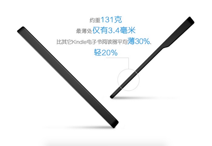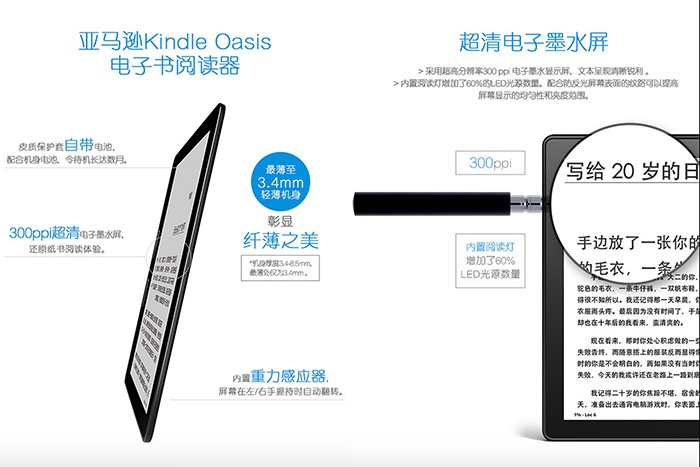 Si tous les détails sont en chinois, ce que l’on peut « comprendre » est que la liseuse Kindle Oasis dispose d’un écran d’une densité de pixels de 300 pixels par pouce, un rétroéclairage LED, et qu’elle mesure 3,4 mm d’épaisseur en son point le plus mince, et de 8,5 mm en son point le plus épais. La liseuse pèse environ 131 grammes.