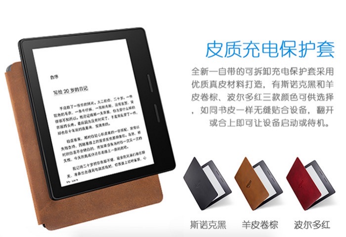 L’étui est disponible en trois coloris, noir, brun et rouge, et il est décrit comme « inclus » avec la Kindle Oasis, ce qui suggère qu’il sera inclus dans le prix de base de la liseuse, et non vendu comme un accessoire séparé.