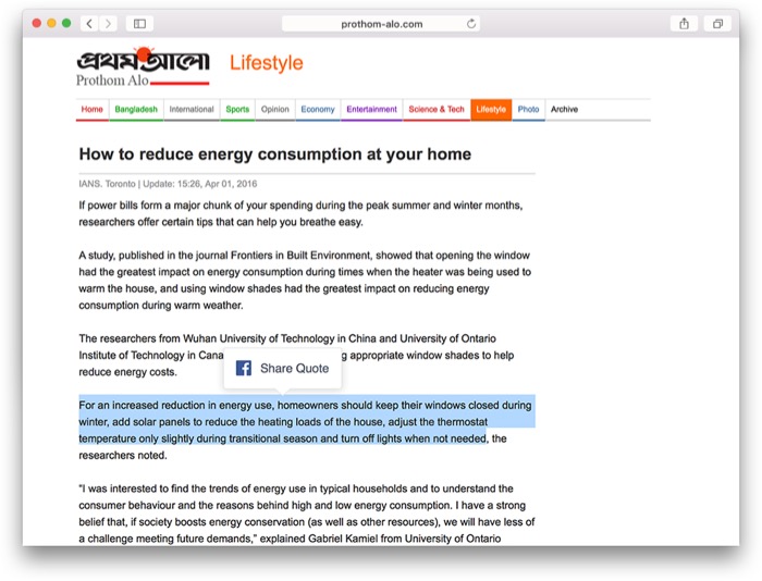Si vous êtes trop paresseux pour copier/coller une citation d’un article ou d’un e-book que vous lisez, Facebook contribue à faciliter et accélérer ce processus. Le partage d’une citation vous permet de mettre en évidence tout simplement le texte en le surlignant, avant de cliquer sur « Share Quote » (« Partager la citation ») pour que Facebook puisse générer un message dans un format de bloc de citation qui comprendra l’URL de l’article que vous citez.
