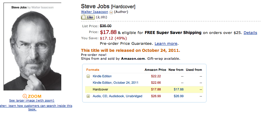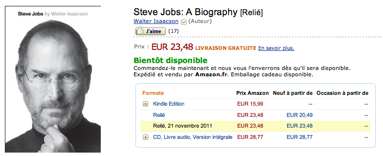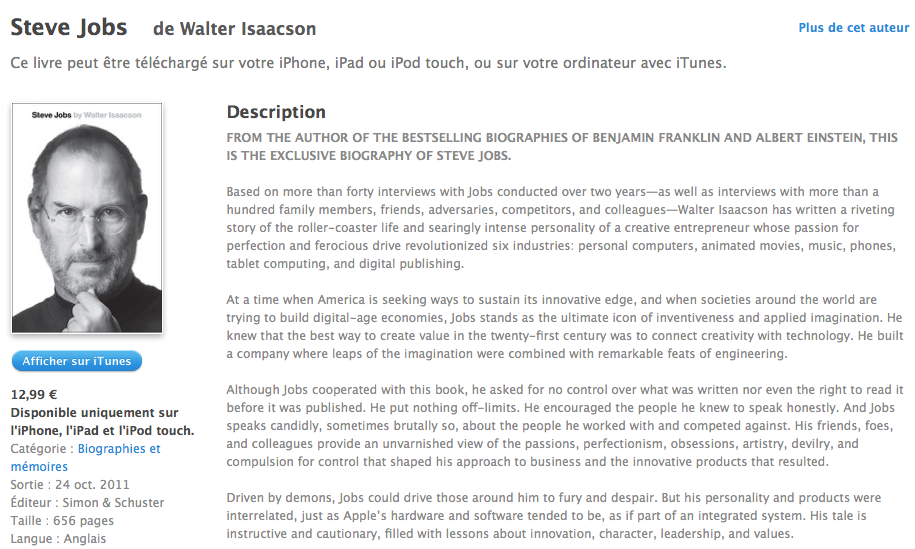 Les pré-ventes pour la biographie ont bondi de 39,6% après que l’ancien PDG d’Apple soit décédé plus tôt ce mois-ci, et le fait que les propriétaires du Kindle ont mis la main sur une copie du livre, et ce en même temps que sur l’iTunes Store est un vrai signe de l’influence d’Amazon et son pouvoir considérable dans le secteur de la distribution d’aujourd’hui.