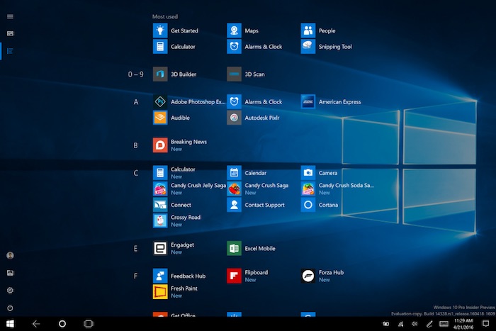 La nouvelle version contient beaucoup plus que des améliorations Ink. Le menu Démarrer a été revu pour faire que toutes les applications soient visibles en permanence, et en mode tablette, que ces dernières soient maintenant visibles en plein écran. Toujours en mode tablette, la barre des tâches peut être automatiquement masquée, ainsi qu’en mode bureau.