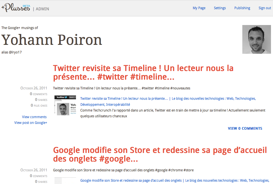 Plusses est un outil formidable pour quelqu’un qui n’a pas un blog hébergé WordPress, ou quelqu’un qui est à la recherche d’un moyen facile de créer un blog. Plusses exploite la puissance du réseau social Google+ et lui donne la touche finale esthétique ! C’est vraiment très bien pensé de la part de Daniel…