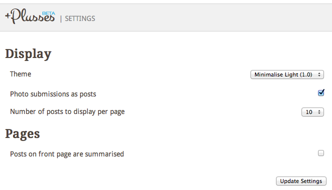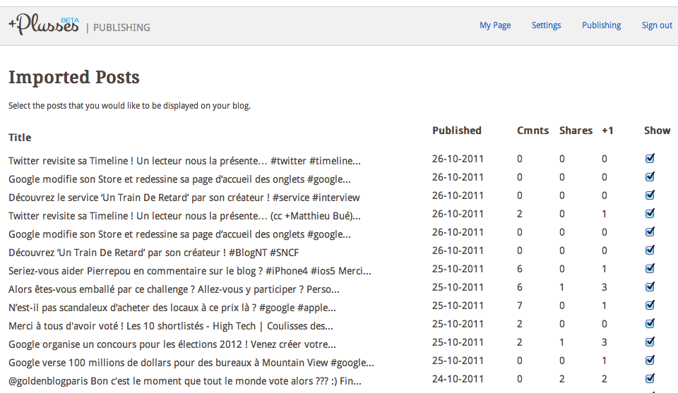 Une autre caractéristique qui va être très appréciée par les utilisateurs, est la possibilité de sélectionner les publications qui apparaissent sur votre blog. Autrement dit, si vous utilisez Google+ pour partager tout et n’importe quoi, et que vous ne voulez pas nécessairement afficher sur un blog, et bien Plusses a pensé à vous ! En effet, une simple fonctionnalité va vous permettre en cliquant sur une case à cocher, de choisir les articles à supprimer. Ainsi, vous aurez un blog avec un contrôle total de vos articles.