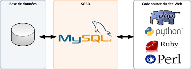 Le système qui gère des bases de données est connu comme un Système de Gestion de Base de Données, ou SGBD. MySQL est un exemple d’un SGBD. Pouvant généralement prêter à confusion, les SGBD sont souvent et maladroitement appelés “bases de données” aussi. Cependant, strictement parlant la base de données est la donnée elle-même, tandis que le SGBD est le logiciel qui fonctionne avec la base de données.