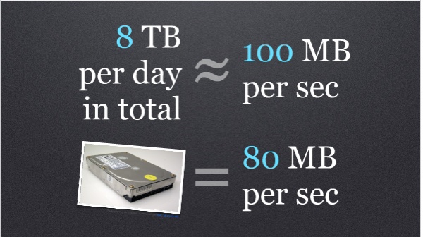 Toujours dans sa présentation, Krikorian annonce que les 150 millions d’utilisateurs de Twitter génèrent 1000 Tweets par seconde, et que Twitter veut à terme être en mesure de soutenir la moitié de la population mondiale et l’ensemble de leurs appareils (5 milliards de personnes et 6 milliards d’appareils). C’est un défi pour le réseau, dit Krikorian, comprenant l’indexation, la recherche, l’analyse, le stockage, l’évolutivité et l’efficacité.