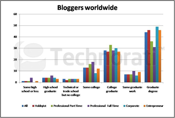 Les personnes interrogées sont pour la plupart des amateurs (61%) qui ne publient pas tous les jours. En fait, seulement 11% des blogueurs interrogés publient sur une base quotidienne. 13% des blogueurs le font pour avoir un revenu supplémentaire, et seulement 5% vivent de leur blog. Parmi les professionnels, 37% disent que le blog constitue la majorité de leurs revenus. Le reste des blogueurs le font pour promouvoir une marque ou une entreprise – 13% sont des entrepreneurs et 8% sont des entreprises.