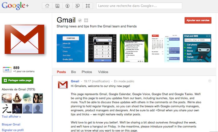 À titre d’exemple, on peut dorénavant retrouver une page Gmail afin de présenter Gmail, Google Agenda, Google Voice, Google Chat et Google Tasks. Selon le Community Manager, Google va utiliser cette page pour nous informer des mises à jour des services, y compris les lancements, des trucs et astuces, et bien plus…