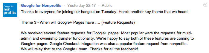 We received several feature requests for Google+ pages. Most popular were the requests for multi-admin and ownership transfer functionality. We’re happy to say both of these features are coming to Google+ pages. Google Checkout integration was also a popular feature request from nonprofits. We will relay that to the Google+ team. Thanks for all the feedback!