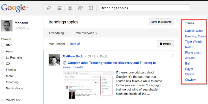 Google+ démarre progressivement en ajoutant des fonctionnalités à son service, et incorpore petit à petit des fonctionnalités intéressantes des autres services sociaux telles que les sujets tendances (trending topics, en anglais), très connus sur Twitter…