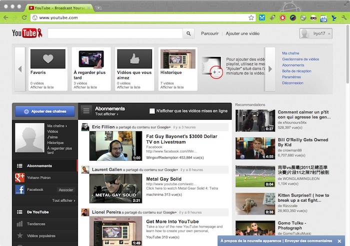 Vous aurez d’abord remarquer que la page d’accueil a été complètement réorganisée en trois colonnes qui mettent bien en évidence vos abonnements sur le côté gauche. La colonne centrale montre d’abord toutes les dernières vidéos de chaînes auxquelles vous avez souscrites. Il est maintenant beaucoup plus facile de basculer rapidement entre vos vidéos personnelles, celles que vous aimez, l’historique de vos visualisations, ainsi que les vidéos à regarder plus tard, puisque ces liens sont tous intégrés dans le coin supérieur gauche de la page.