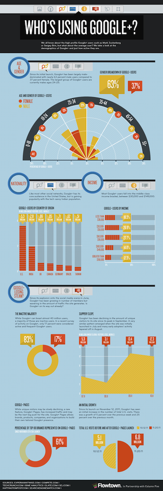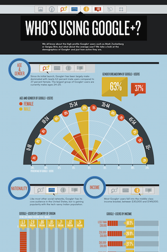 La statistique la plus intéressante est probablement que seulement 17% des 40 millions actuels utilisateurs sont actifs sur le réseau, et représentent les utilisateurs fréquentant le plus Google+. Depuis son lancement, Google+ est majoritairement fréquenté par des hommes (63%), dont la majorité des utilisateurs ont entre 25 et 34 ans.