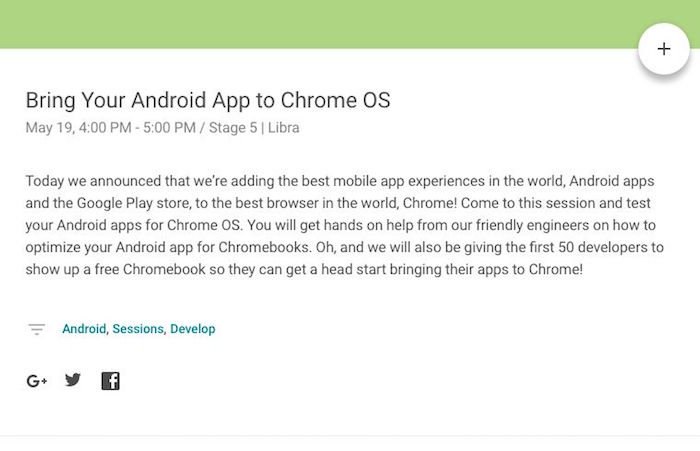Bien que la session semble avoir disparu, celle-ci a été intitulée : « Apportez votre application Android à Chrome OS ». Selon la description, Google va « ajouter les meilleures expériences d’applications mobiles dans le monde, les applications Android et le Google Play Store, dans le meilleur navigateur du monde, Chrome ! ». Google encourage les développeurs à participer à la session pour obtenir de l’aide de la part des ingénieurs de Google pour tester leurs applications Android et s’assurer que celles-ci sont bien prises en charge sur les Chromebooks.