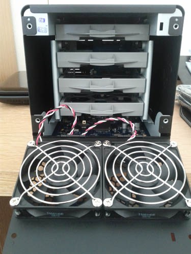 Le Synology DiskStation DS411 est très facile à monter / démonter que ce soit pour son installation initiale, ou encore son entretien. Pour accéder à la structure interne il vous suffit de retirer les quatre vis à l’arrière du châssis qui tiennent le châssis. Une fois les vis retirées vous pouvez le retirer et ainsi accéder aux baies des disques.