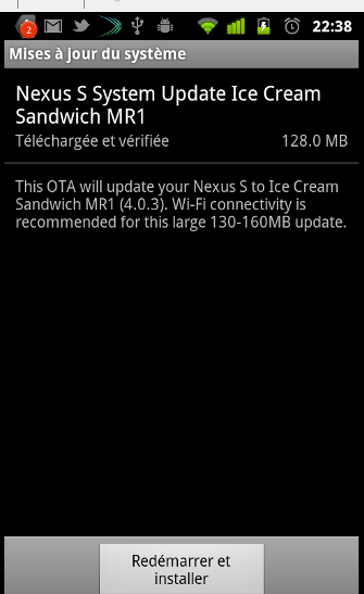 Il semblerait qu’il y ait une astuce pour avoir la mise à jour plus rapidement mais cela ne fonctionne pas sur mon Nexus S (Merci à @jeanviet pour l’astuce !).