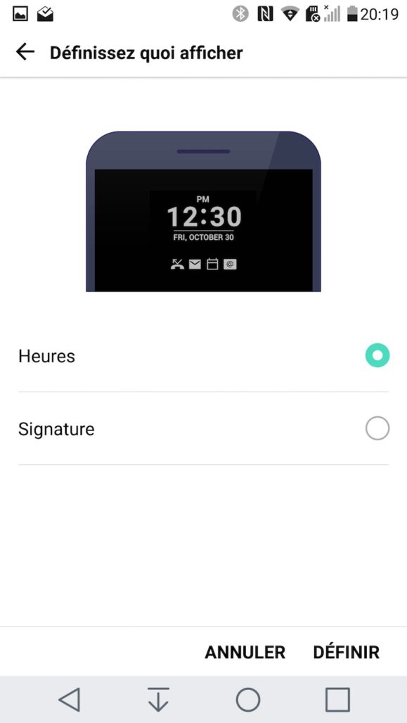 Enfin, l’écran LCD IPS du G5 a été intelligemment conçu pour lui permettre de supporter la caractéristique Always On Display. Cette dernière signifie que le téléphone pourra toujours afficher l’heure et la date, ainsi que toutes les notifications provenant de tiers. La personnalisation est limitée au simple ajout d’un message personnel, ce qui est un peu dommage.