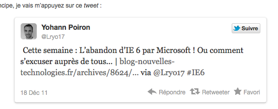 Cette semaine : L’abandon d’IE 6...à#IE6</a></p>. Remplacez ce contenu par le contenu de votre tweet.