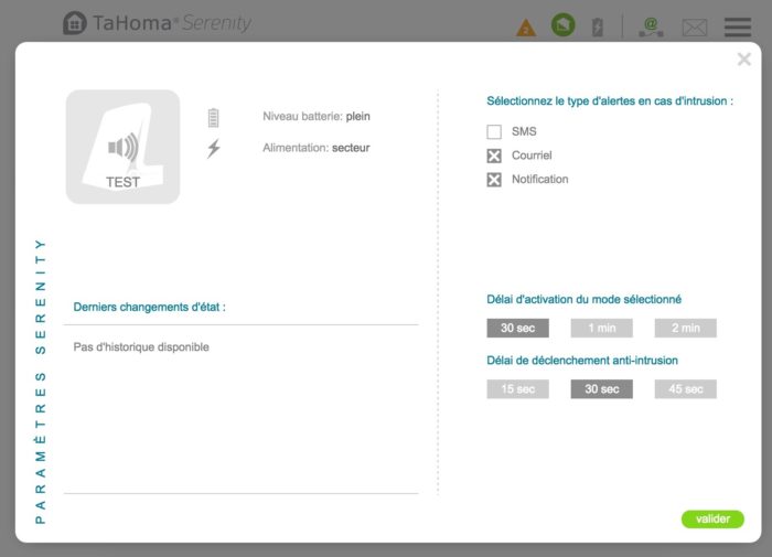 Pour paramétrer un mode de sécurité, cliquez sur l’icône de la petite maison à côté de l’icône de batterie, et sélectionnez le mode. Ensuite, sélectionnez les détecteurs à activer (seulement pour les 2 modes partiels), les alertes à envoyer en cas d’intrusion, vos équipements et les actions de Protection active à effectuer en cas d’intrusion, ou de désactivation du système et également la sirène.
