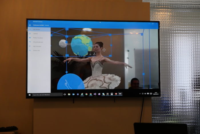 Pour ma première expérience avec le casque HoloLens, j’ai pu jouer avec divers « hologrammes ». L’utilisation de ces derniers est très aisée. J’ai pu prendre divers objets, personnages, etc., et les placer dans mon environnement naturel. Ainsi, j’ai pu accrocher une lune au plafond, un tigre au sol, ou encore une danseuse aux étoiles, tournoyant magnifiquement dans la pièce.