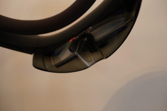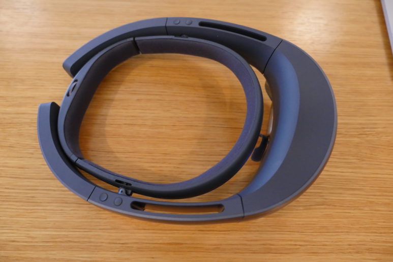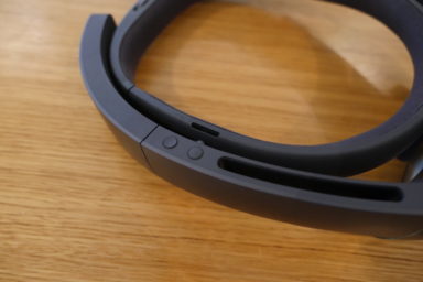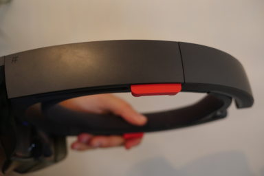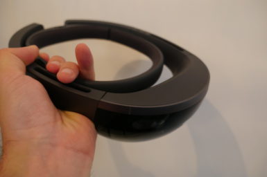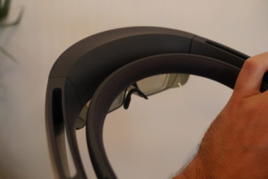 Le casque HoloLens est essentiellement composé de deux anneaux : l’un plus épais en plastique qui contient tous les composants, et un plus mince, avec un rembourrage intérieur qui enveloppe votre tête. L’ajustement de la bague à l’arrière permet de régler le casque sur votre tête — un processus semblable à celui que l’on peut retrouver sur un casque de vélo par exemple.