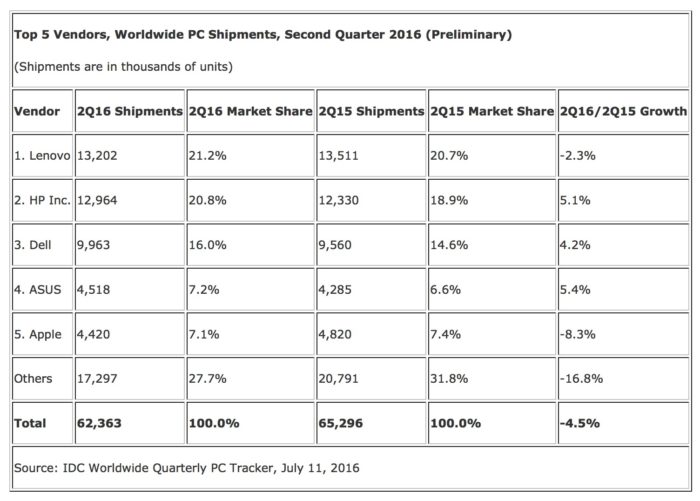 La concurrence est féroce, et ces données démontrent l’état changeant de l’industrie. Si nous vivons dans l’ère du mobile, il y a encore beaucoup d’ordinateurs portables et d’ordinateurs de bureau sur le marché. Les analystes d’IDC rapportent que 62,4 millions d’ordinateurs personnels ont été vendus dans le monde entier au cours du deuxième trimestre de l’année 2016.