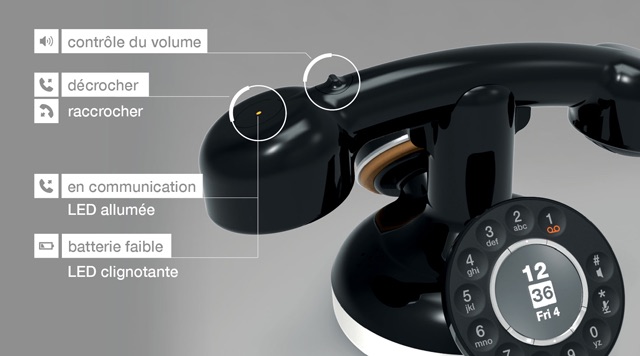 L’appareil se compose d’une base avec un cadran rotatif des années 1930, mais avec des numéros qui sont composés à l’aide de boutons tactiles, et est livré avec un récepteur supplémentaire, qui permet à un autre participant de non seulement écouter un appel, mais aussi d’y contribuer grâce au microphone intégré.