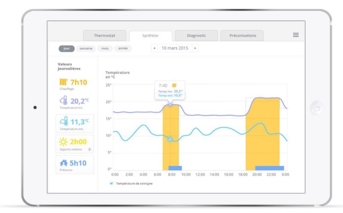 Enfin, vous allez pouvoir visualiser l’historique de votre chauffage sous formes graphiques, et ainsi comprendre comment vous chauffez afin d’optimiser vos programmes pour réaliser des économies supplémentaires. Chaque mois, un rapport sera envoyé. À vous les économies !