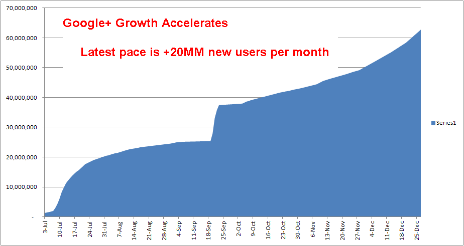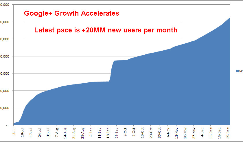 Si les statistiques qu’il note ci-dessus sont correctes, cela voudrait dire que 25% de tous les utilisateurs actuels de Google+ ont rejoint le service durant le seul mois de Décembre. De plus, il indique que si ce taux est toujours en constante progression comme actuellement, Google+ devrait atteindre les 100 millions d’utilisateurs d’ici le 25 février, et 200 millions le 3 août…
