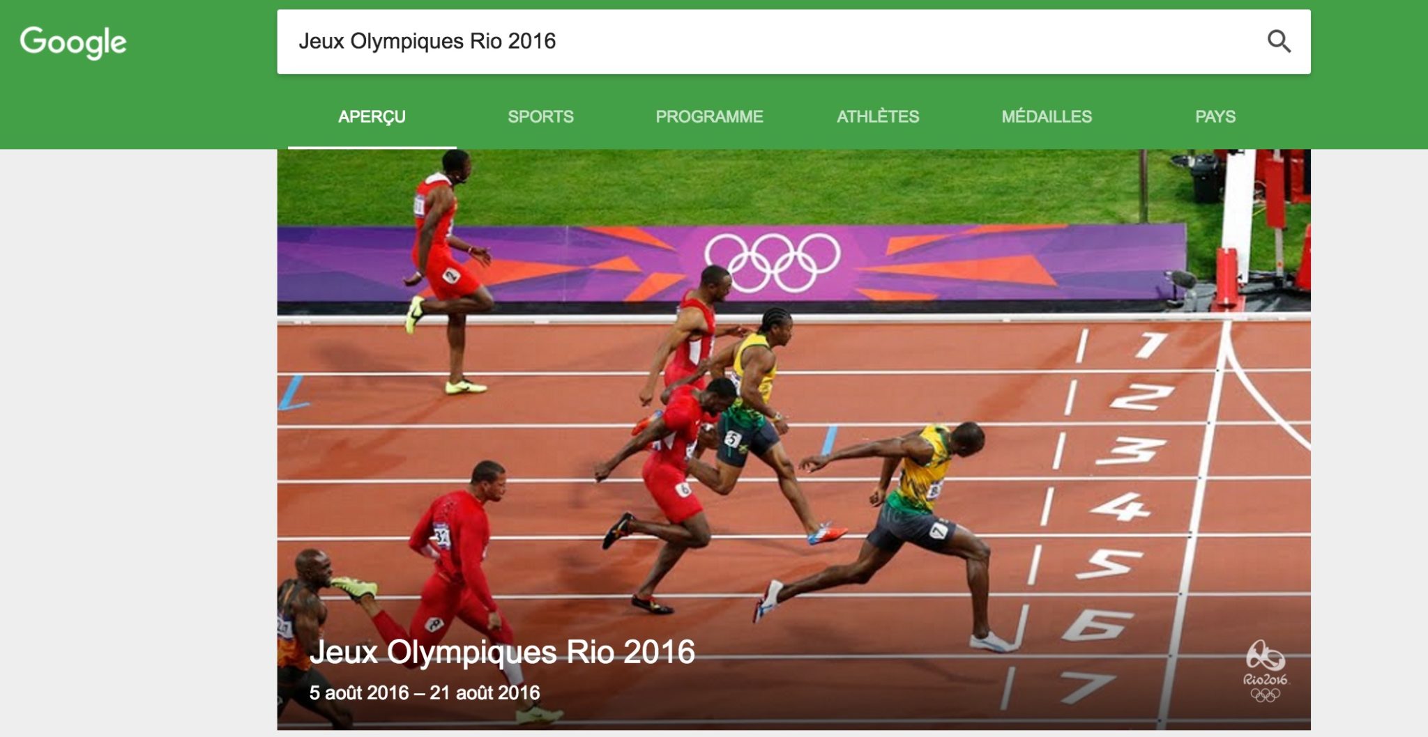 Premièrement, Google va faciliter les recherches sur mon célèbre moteur. Tapez une requête sur un événement olympique dans Google et vous verrez une carte tronquée organisée du programme, des athlètes, des médailles, et des pays. La section « Sports » liste les détails des 42 épreuves des JO, c’est-à-dire, les événements à venir, les médailles par équipe et les athlètes qui les ont obtenus.