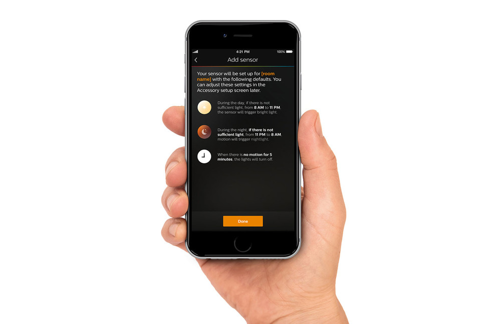 Grâce à l’intégration entre le nouveau détecteur de mouvement, Philips Hue Sensor et votre système Philips Hue, vous pouvez définir quelles lumières peuvent être déclenchées lorsque vous entrez dans une pièce.