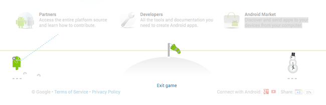 Pour le lancer, il suffit de cliquer le logo Android en bas de la page d’accueil du site (www.android.com), et vous pouvez commencer à jouer. Pour cela, utilisez votre souris pour lancer des boules de neige sur le bonhomme de neige en face de vous !