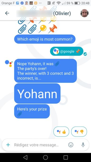 Vous pouvez réellement parler à Assistant dans une conversation privée, ou l’appeler au milieu d’un chat avec des amis en tapant @google et lui poser une question. Personnellement, j’ai trouvé Assistant très utile dans une discussion avec des amis. Si vous avez une interrogation, il suffit de poser la question à l’assistant pour avoir la réponse. L’outil vous renverra la réponse du mieux qu’il peut.