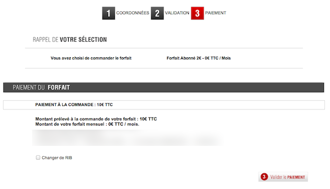 - 5 – Dernière étape, la 3 : il s’agit du paiement. Vous aurez un rappel de votre sélection, et dans le meilleur des mondes, votre RIB sera automatique rempli (si vous êtes abonnés Free). Sinon, je suppose que vous devrez tout remplir