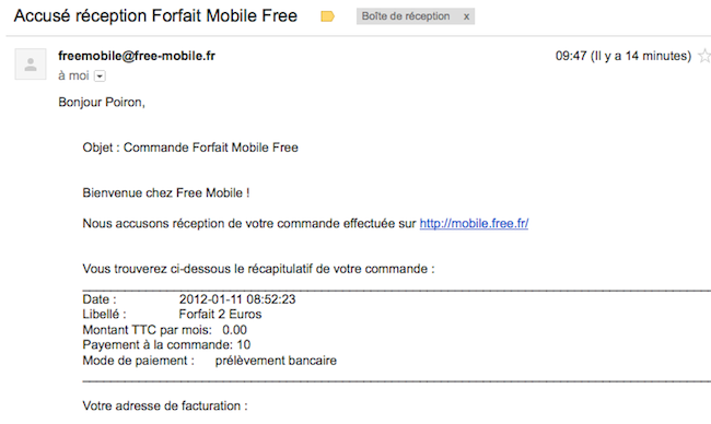 Alors, qu’hier soir je vous annonçais qu’il m’était impossible de me connecter au site de mobile.free.fr, ou plus précisément un site Web indisponible, ce matin j’ai enfin réussi à m’inscrire et me prendre un forfait. Actuellement étant encore chez SFR, et avant de migrer totalement ma ligne, j’ai décidé de prendre le forfait à 2€/mois, ou plutôt 0€/mois vu que je suis abonné Free ! Autant dire que je ne risque rien, hormis les 10€ pour l’envoi de la carte SIM…