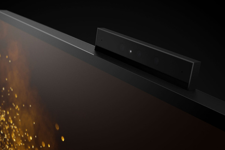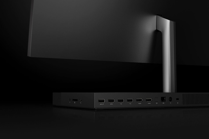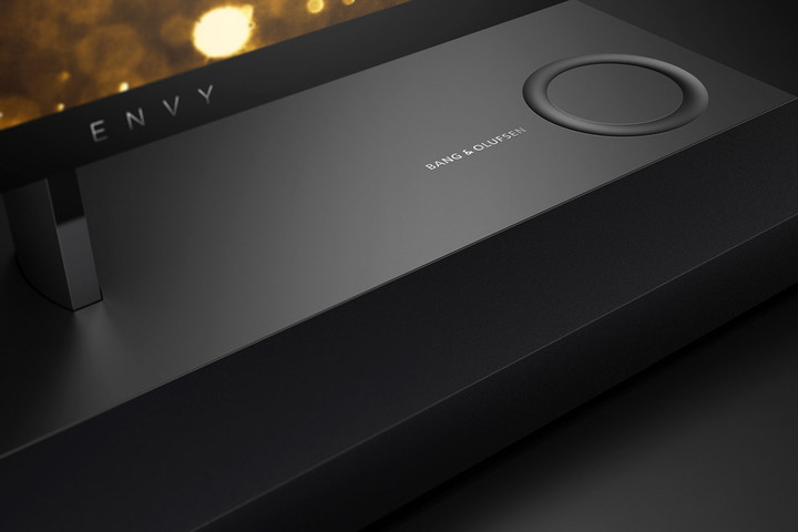 En façade, on retrouve nos haut-parleurs. Ils sont conçus en partenariat avec Bang & Olufsen. La barre de son est en fait dans la base, et elle est contrôlée par un cadran audio, ce qui est plutôt unique dans l’informatique.