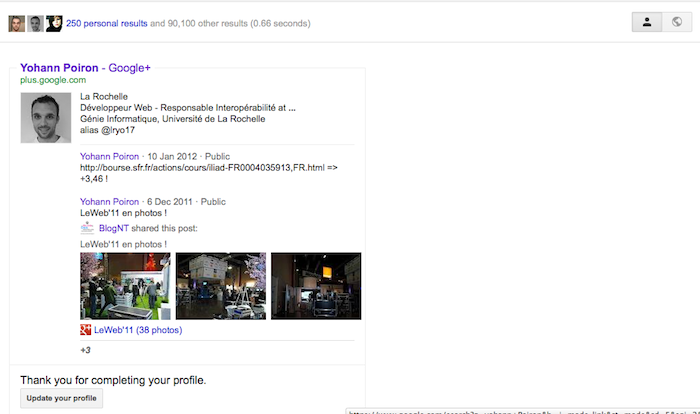 Alors que Google déploie, comme à son habitude, progressivement la nouvelle fonctionnalité, jusqu’à présent, il semblerait que l’ensemble des résultats personnalisés proviennent uniquement de vos réseaux Google+…