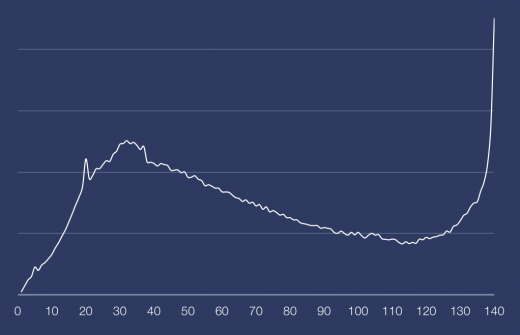 On pourra noter que les 110 caractères semblent être le point le plus bas du graphique. On peut également remarquer une certaine constance aux alentours de 100 caractères, certainement du à un lien d’une URL raccourcie qui a été tweeté avec le titre de l’article du blog, ou du site Web. La plupart des articles, comme celui-ci, tente d’offrir un maximum d’informations, tout en laissant place à l’URL, et quelques caractères pour le retweet. Veuillez noter que si vous utilisez le raccourcisseur d’URL proposé par Twitter, t.co, votre URL ne fera plus que 20 caractères…