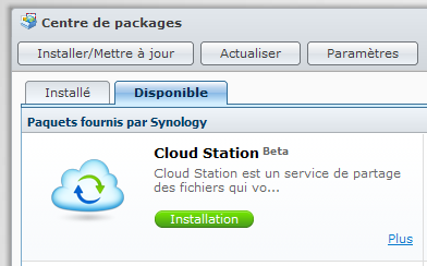 Cliquez ensuite sur l’onglet Disponible pour visualiser la liste des packages disponibles, puis cliquez sur Installation au niveau du package Cloud Station