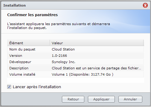 L’installation démarre une fois le paquet téléchargé par le NAS, vous demande sur quel volume l’installer puis vous affiche un récapitulatif qu’il ne vous reste plus qu’à valider :